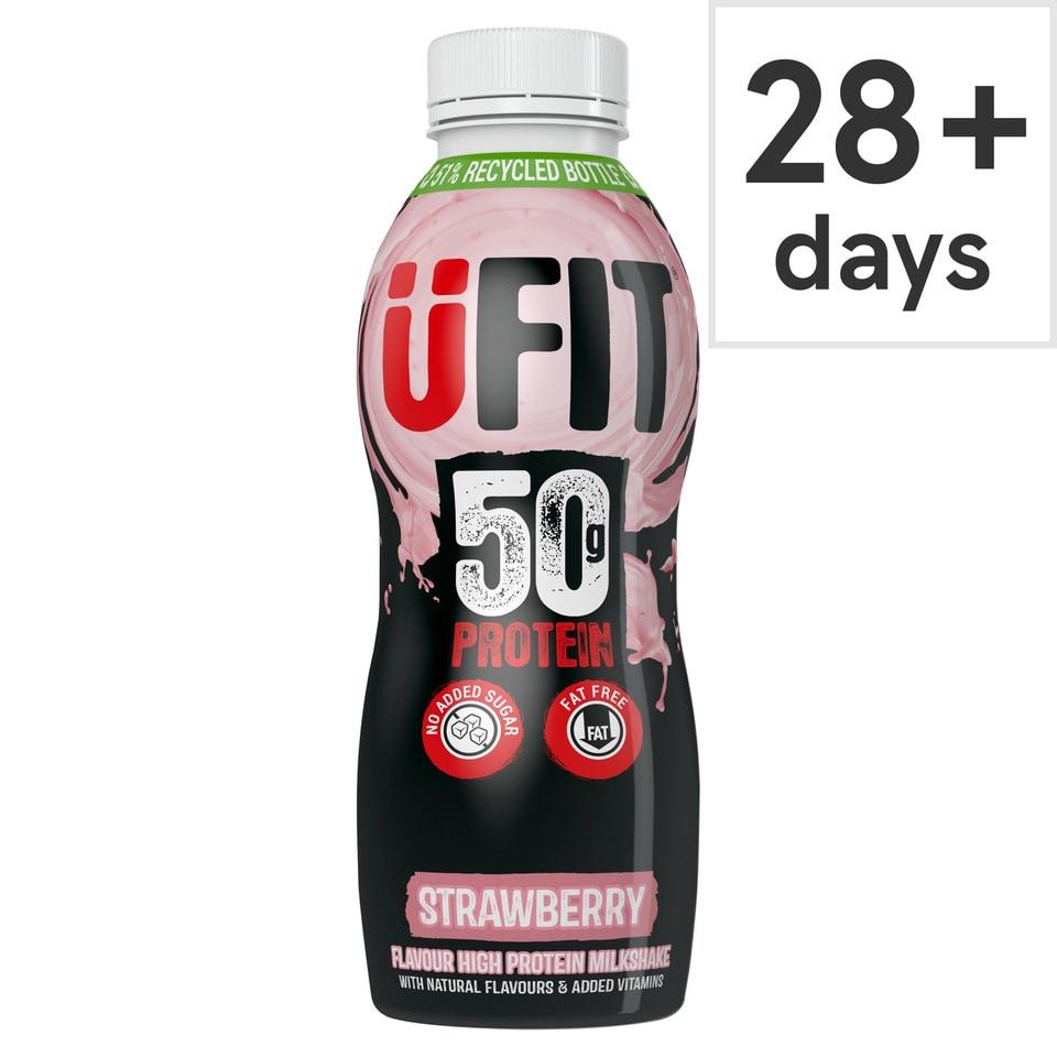 Ufit Pro50 Protein Drink Strawberry 500MlA deliciously protein packed, fat free shake with no added sugar a source of vitamin C, with natural flavoursUFit is a high protein strawberry flavour milkshake drink with sweetener, natural flavours, added vitamins and contains naturally occurring sugars.50g ProteinNo Added SugarFat FreeWith Natural Flavours & Added VitaminsVegetarian Society ApprovedPack size: 500MLNo Added SugarFat Free